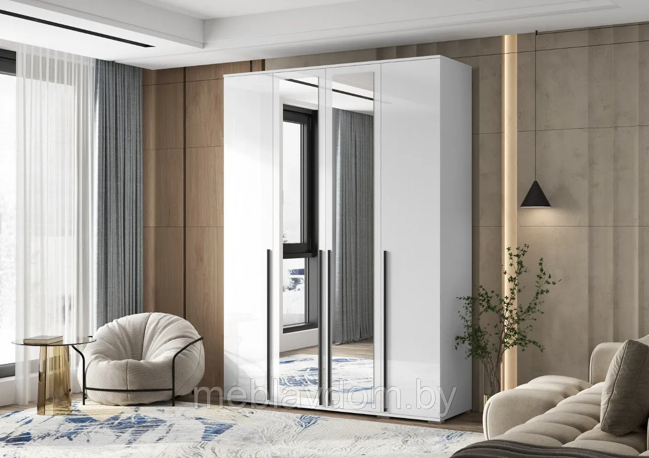 Шкаф 4-х створчатый Норд с зеркалом (1600) - Белый / Белый глянец (МИФ)