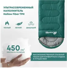 Внешняя ткань — Polyester Rip Stop 210T 68D с водоотталкивающей пропиткой: прочная, износостойкая, но мягкая, защищает от влаги, например от конденсата в палатке. Подкладка — дышащий Polycotton T/R 88X64 с добавлением хлопка: легкая, приятная на ощупь, с высокой паропроницаемостью, эффективно отводит влагу от тела. Утеплитель Hollow Fiber TPH собственной разработки содержит волокна с микроскопическими порами, которые создают дополнительные воздушные камеры — это обеспечивает высокую теплоизоляцию при небольшом весе. Упругие волокна быстро расправляются после распаковки, придавая спальнику объем и мягкость.Бренд: RSP